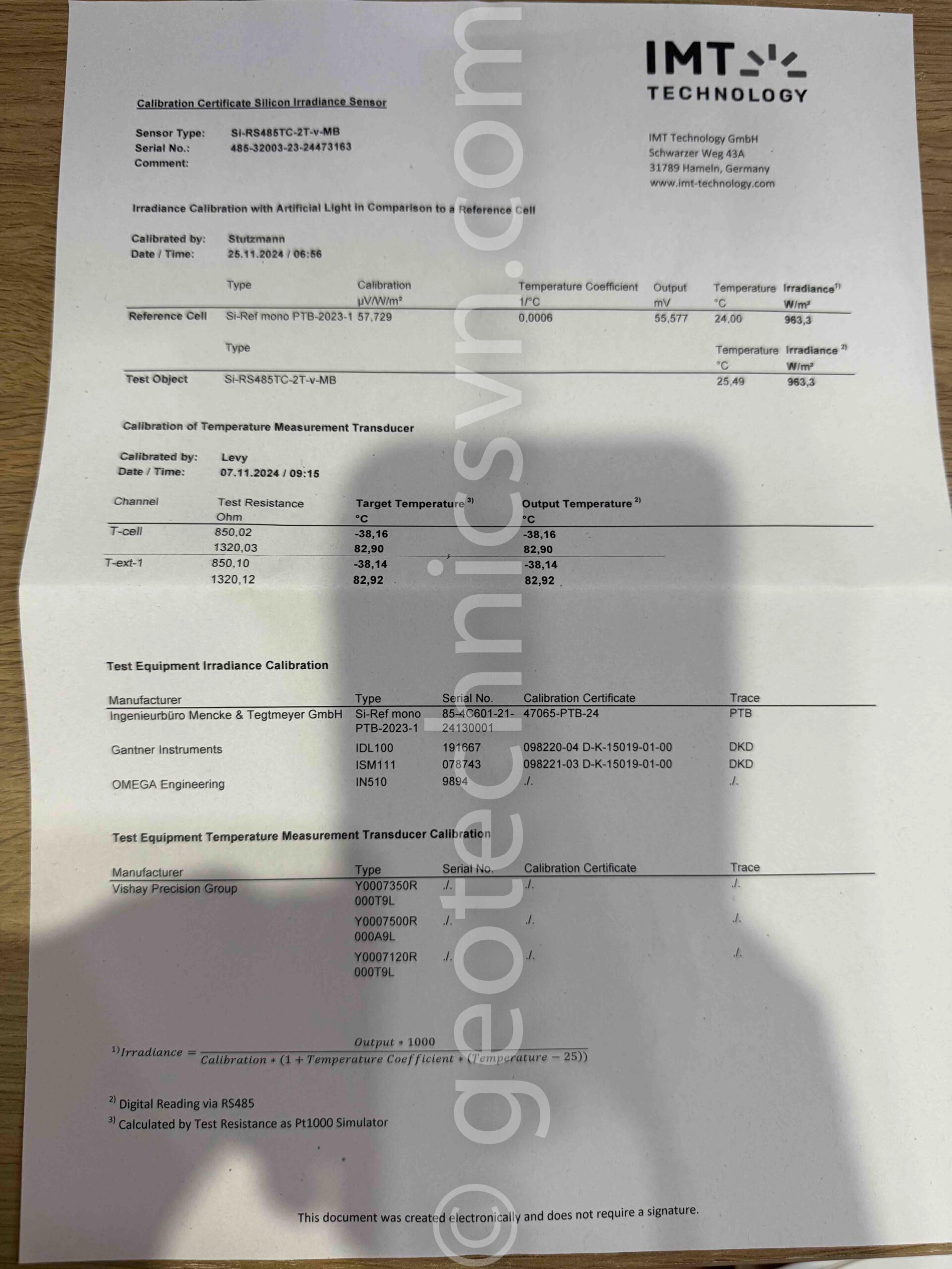 Cảm biến đo bức xạ Silicon_Irradiance_Sensor_Si_RS485TC được sản xuất bởi Ingenieurbüro Mencke & Tegtmeyer Technology – Germany là một trong những sản phẩm được Công ty cổ phần thiết bị quan trắc Địa kỹ thuật và Môi trường Việt Nam nhập khẩu trực tiếp, phân phối chính hãng và lắp đặt tại Việt Nam và các nước lân cận trong khu vực. Sản phẩm có đầy đủ giấy tờ chứng nhận nguồn gốc xuất xứ Certificate of Origin (CO), giấy chứng nhận chất lượng sản phẩm Certificate of Quality (CQ) và hiệu chuẩn Calibration Certificate.